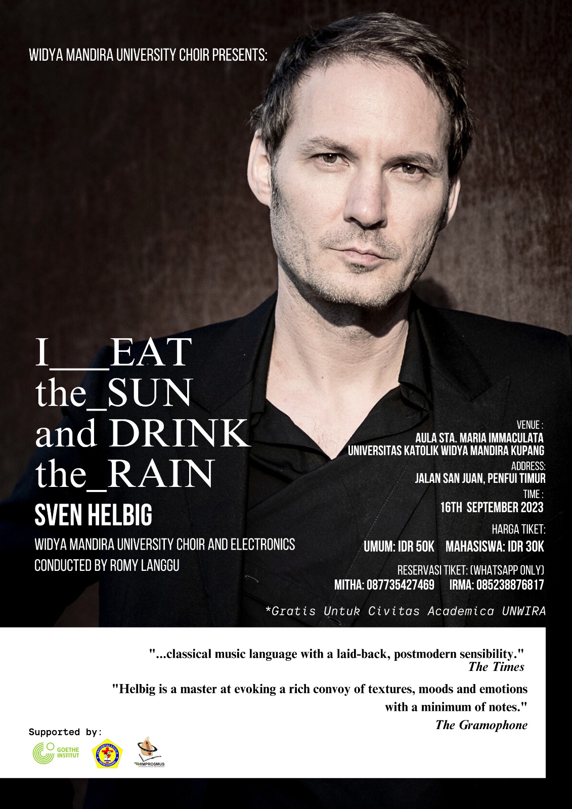 I Eat the Sun and Drink the Rain is a song cycle of ten darkly melancholic pieces for choir and electronics based around lyrics that are predominantly by Sven Helbig. The composer himself describes the work as: “A poetic journey in search of humanity." The modern song cycle spans from the archaic Kyrie Eleison, to Leopardi’s L’Infinito, to modern reflections on the human soul as a beautiful but small part of nature. In ten episodes, it describes humans trying to find redemption, resonating with nature and immersing in deep spirituality. Gentle choral textures meet digital sound creations and layer mesmerizing a capella compositions onto the composer’s pulsing electronical sounds. For the live concerts the sonically powerful work is accompanied by the hypnotic visuals of Icelandic video artist Máni M. Sigfússon. The choir of the Widya Mandira University, conducted by Romy Langgu, will be joining Sven Helbig on stage for the performance at Aula Santa Maria Imakulata. The choir will be specially dressed for this production in creations by acclaimed Berlin fashion designer Esther Perbandt. I Eat the Sun and Drink the Rain has been successfully performed in North- and South America, Canada and across Europe. The Widya Mandira University is proud to present the Asia premier of this work. <p> <a href="https://concerto.unwira.com/" target="_blank">https://concerto.unwira.com/</a> </p> " I Eat the Sun and Drink the Rain" adalah siklus lagu yang terdiri dari sepuluh bagian yang penuh dengan nada gelap dan melankolis untuk paduan suara dan elektronik, berdasarkan lirik yang sebagian besar diciptakan oleh Sven Helbig. Komposer itu sendiri menggambarkan karya ini sebagai: Perjalanan Puitis dalam pencarian akan kemanusiaan. Siklus lagu modern ini membentang dari Kyrie Eleison yang kuno, hingga L'Infinito karya Leopardi, hingga refleksi modern tentang jiwa manusia sebagai bagian cantik, namun kecil dari alam. Dalam sepuluh episode, ia menggambarkan manusia berusaha menemukan penebusan, beresonansi dengan alam, dan tenggelam dalam spiritualitas yang mendalam. Tekstur paduan suara yang lembut bertemu dengan kreasi suara digital dan menyatukan komposisi acapella yang memukau dengan suara elektronik berdenyut milik komposer. Untuk konser live, karya yang penuh daya sonik ini disertai oleh visual hipnotis dari seniman video Islandia, Máni M. Sigfússon. Paduan suara dari Universitas Katolik Widya Mandira, yang dipimpin oleh Romy Langgu, akan bergabung dengan Sven Helbig di atas panggung pertunjukan di Aula Santa Maria Immaculata. Paduan suara akan khusus berpakaian untuk produksi ini dengan kreasi dari perancang busana terkenal dari Berlin, Esther Perbandt. " I Eat the Sun and Drink the Rain" telah berhasil dipentaskan di Amerika Utara dan Selatan, Kanada, dan di seluruh Eropa. Universitas Katolik Widya Mandira dengan bangga mempersembahkan karya ini dalam premier Asia. <br> <p> <a href="https://concerto.unwira.com/" target="_blank">https://concerto.unwira.com/</a> </p>