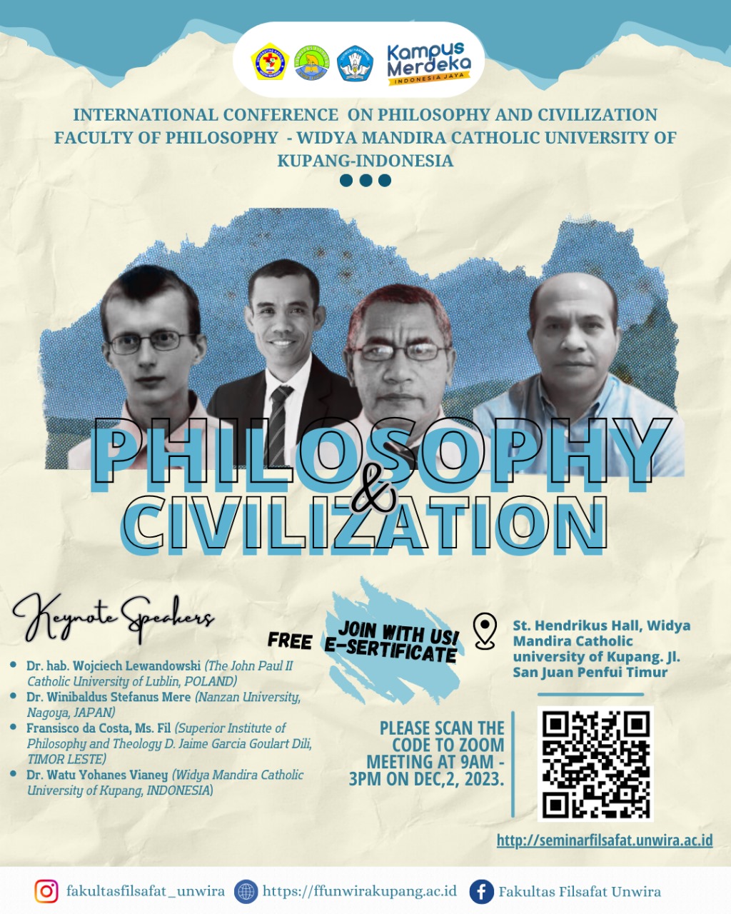 Pada 2 Desember 2023 mendatang, Fakultas Filsafat Universitas Katolik Widya Mandira Kupang, akan mengadakan seminar internasional bertajuk: “Philosophy and Civilization”. Seminar internasional ini akan menghadirkan empat keynote speaker yang berasal dari dalam dan luar negeri. Mereka adalah Dr. Hab. Wojciech Lewandowski, dari The John Paul II Catholic University of Lubin, Polandia; Dr. Winibaldus Stefanus Mere, dari Nanzan University, Nagoya, Jepang; Francisco da Costa, Ms. Phil., dari Superior Institute of Philoshopy and Theology D. Jaime Garcia Goulart, Dili, Timor Leste; dan Dr. Watu Yohanes Vianney, M. Hum, dari Fakultas Filsafat Universitas Katolik Widya Mandira. Selain empat keynote speaker, seminar internasional ini juga menghadirkan 17 pemakalah yang berasal dari luar negeri dan beberapa di antaranya berasal dari Indonesia. Persiapan seminar ini berlangsung selama dua bulan, sejak Oktober 2023, yang meliputi Call for Papers dan seleksi naskah. Tema “Philosophy and Civilization” yang diangkat dalam seminar internasional ini sebagai bentuk kepedulian dan jawaban Fakultas Filsafat UNWIRA terhadap empat persoalan yang tengah menghantui peradaban umat manusia dewasa ini, baik secara global maupun nasional. Pertama, revolusi ganda teknologi informasi dan bioteknologi telah memicu tirani dataisme dan kediktatoran digital. Kedua, selama empat dekade terakhir, demokrasi di berbagai negara, termasuk di Indonesia, dihantui oleh kebangkitan populisme kanan dan politik identitas. Ketiga, peradaban manusia tengah dirusakkan oleh barbarisme perang dan terorisme yang melampaui batas-batas negara, serta krisis ekologis yang mengancam masa depan bumi dan umat manusia. Keempat, dalam dua dekade terakhir, kebenaran dan kemanusiaan mengalami disorientasi akibat produksi hoaks dan gelombang pasca-kebenaran. Dekan Fakultas Filsafat UNWIRA, Romo John Subani, Lic. Iur, Can., menyambut dengan gembira kegiatan seminar internasional ini. Menurutnya, seminar ini menyediakan forum bagi akademisi, ilmuwan, praktisi sosial, peneliti, dan spesialis untuk mempresentasikan hasil penelitian terbaik mereka. Kegiatan besar ini berdaya guna dalam menumbuhkan semangat ilmiah-akademis, serta berkontribusi dalam memecahkan persoalan-persoalan global yang dialami masyarakat dunia dewasa ini. Ketua panitia seminar internasional, Pater Petrus Tan, SVD, mengatakan bahwa tujuan utama dari pelaksanaan konferensi internasional ini adalah membangkitkan diskursus interteksualitas dan interdisipliner dalam upaya memahami masalah peradaban kita zaman ini. Menurut Pater Peter, seminar ini juga adalah bentuk kontekstualisasi filsafat. Seminar ini akan terjadi secara hibrid (via zoom dan offline). Seminar ini melibatkan mahasiswa dan akademisi dari semua perguruan tinggi di Kupang, pemerintah, LSM, para pegiat sosial, peneliti, tokoh agama, dan tokoh masyarakat. Kegiatan ini akan berlangsung selama satu hari penuh, dari jam 8.30-20.00 WITA. <div class="container"><object width="100%" height="900" data="https://docs.google.com/gview?embedded=true&url=https://unwira.ac.id/assets/agenda-ffa.pdf"></object></div>